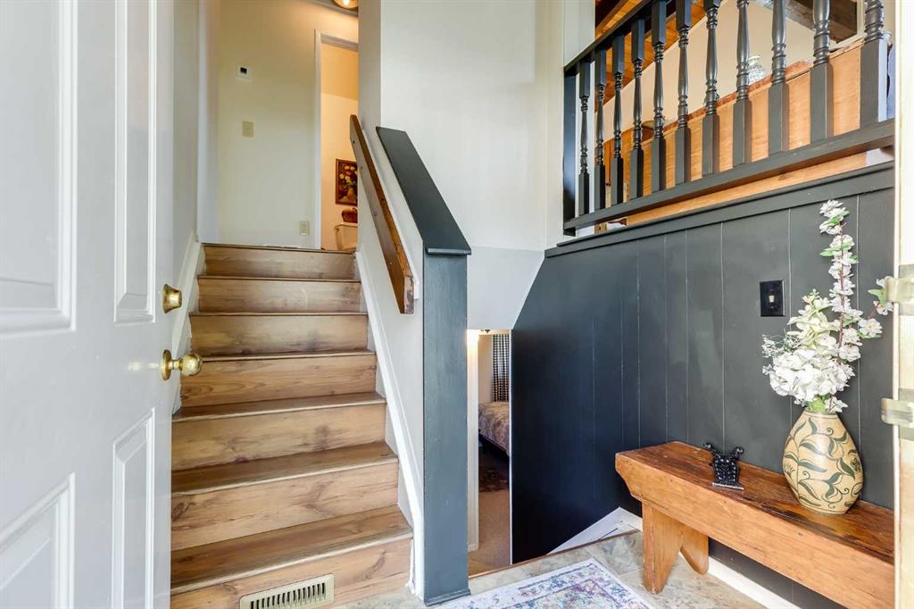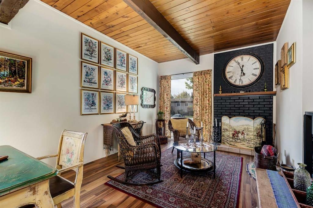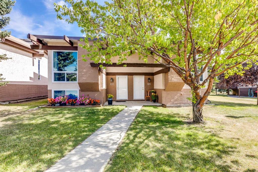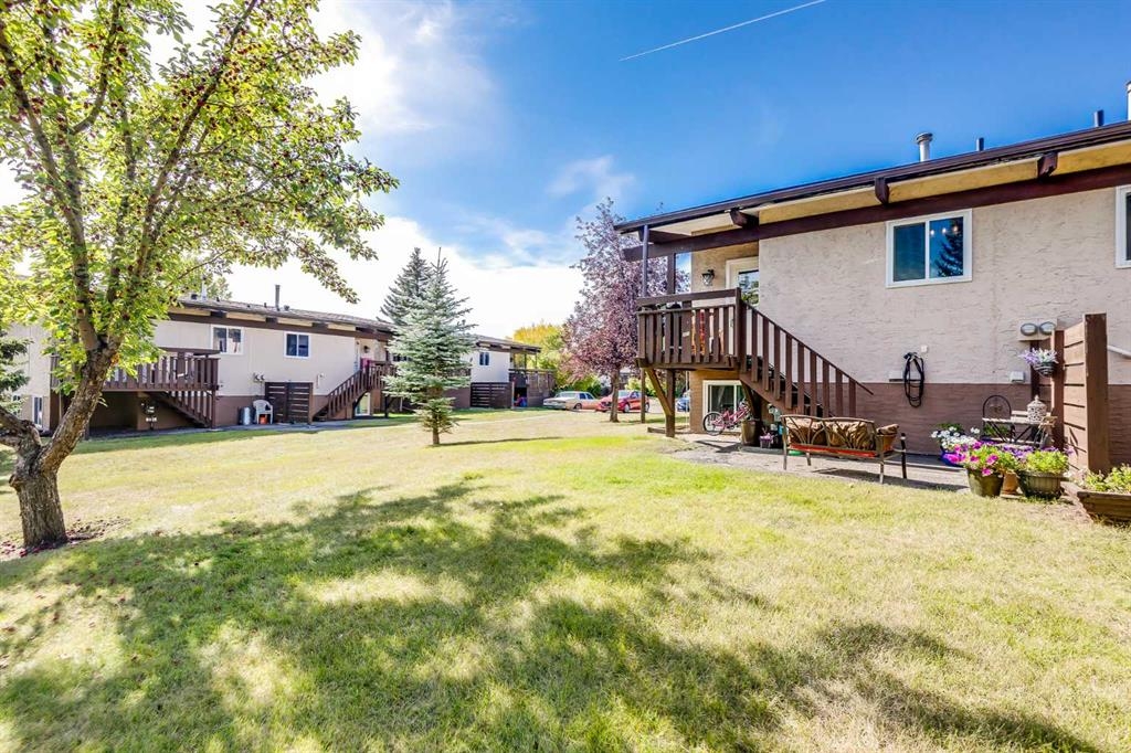 Welcome home to this inviting and cozy townhome that exudes warmth and comfort. Nestled in a quiet condominium community, this cottage-like residence offers a unique blend of character and convenience. As you step inside, you'll be captivated by the open beam vaulted ceiling, which adds a touch of rustic charm to the living space. The centerpiece of the living room is the brick wood-burning fireplace, creating the perfect ambiance for chilly evenings and making it an ideal spot for relaxation and gatherings. Thoughtfully designed to maximize the use of space this townhome features a functional kitchen, separate dining area, two generously sized bedrooms, full bath and good storage. Backing onto a treed green space, enjoy the serenity and privacy as you relax on your deck or patio. No need to worry about parking here! This property comes with two convenient parking stalls, ensuring you always have a place for your vehicles. Plus, this location offers great access to major traffic routes, making your daily commute a breeze. Public transit is also within easy reach, adding to your convenience. Shopping, schools and other amenities including the Village Square Leisure Centre are just a few minutes away. Don't miss out on this opportunity to own a piece of peaceful living with all the benefits of local services and amenities.